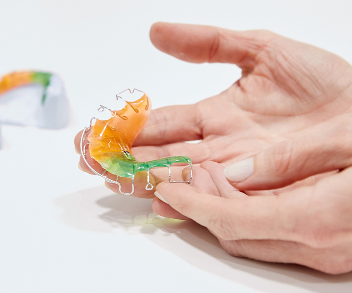 Bei der herausnehmbaren Zahnspange kann das Wachstum genutzt werden, um Kieferfehlstellungen zu korrigieren. Damit das gewünschte Ergebnis erzielt werden kann, ist eine gute Mitarbeit des Patienten gefordert. Die Mundhygiene ist bei der „losen" Zahnspange nicht beeinträchtigt.